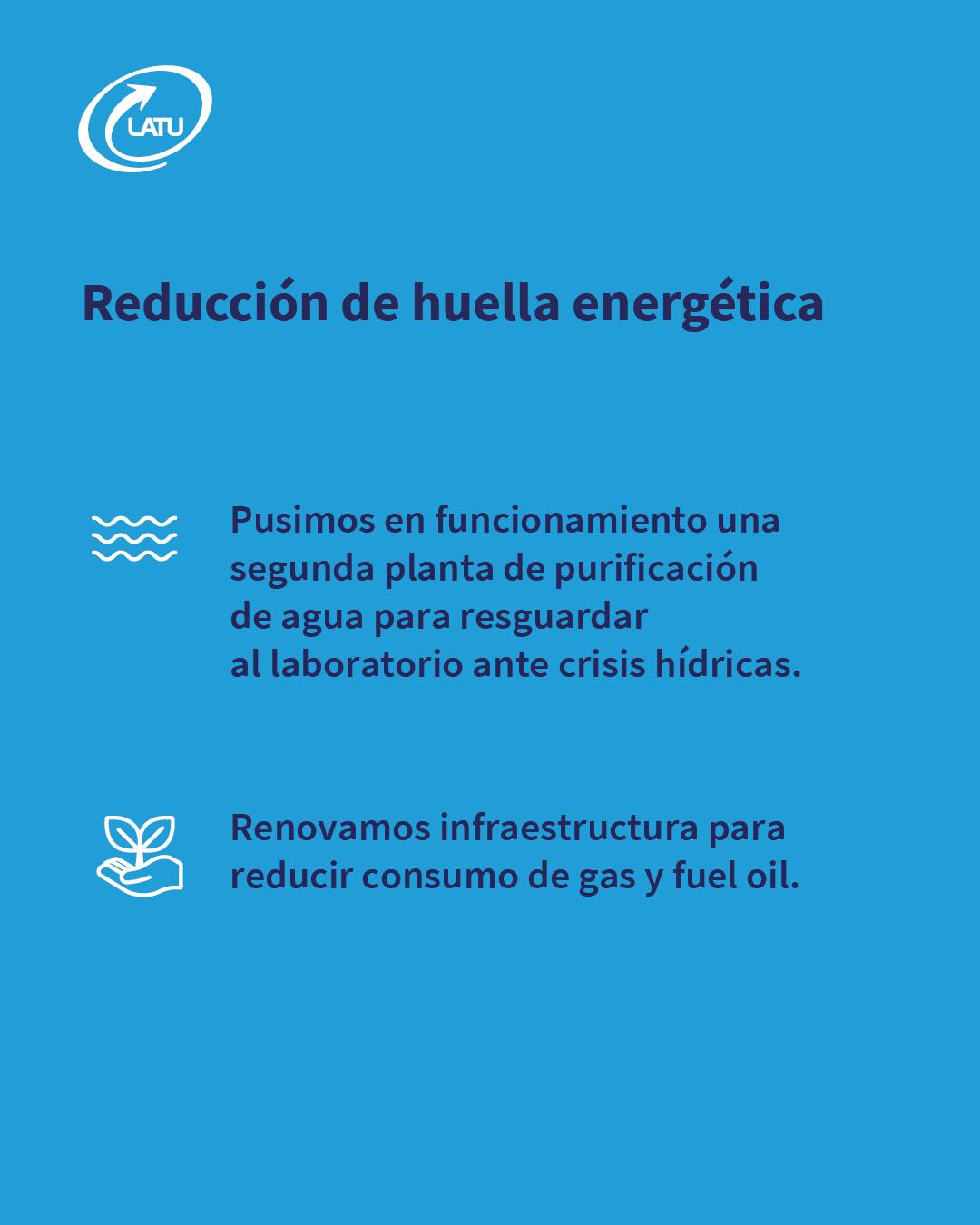 - Reemplazo de equipos de destilación: se logró el reemplazo del 100% de los destiladores de agua tradicionales ubicados en los laboratorios (M5 y M6) sustituyendo los mismos por equipos de ósmosis inversa. Esto repercute en un ahorro energético importante (tanto por la vía del consumo de energía eléctrica como de vapor) y del uso del agua para los procesos.